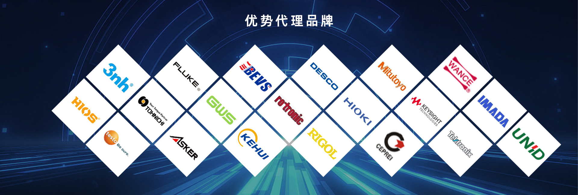 代理合作的品牌有:GWS、Espec、Weiss、BEVS、B&K、Ceprei、Keysight、Fluke、Tektronix、Rohde & Schwarz、testo、Mitutoyo、Hexagon、Mahr、Nikon、Asker、Imada、Zeiss、Tztek、Tohnichi、Hios、创牛、万测、众志、普源、同惠、致远、长盛、固纬、康斯特、成量等。